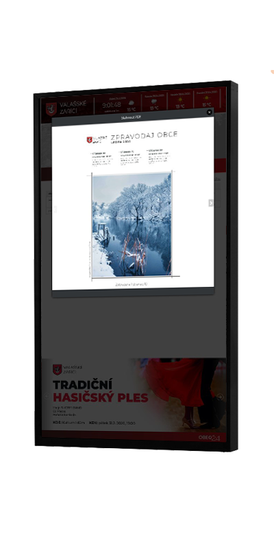 Nabízíme řešení pro všechny města a obce, které potřebují dynamicky komunikovat se svými občany uvnitř úřadu. Indoorové řešení je vhodné jako dočasná info plocha - samostatně stojící model, nebo permanentní informační zdroj, který lze v horizontální nebo vertikální podobě připevnit na zeď.